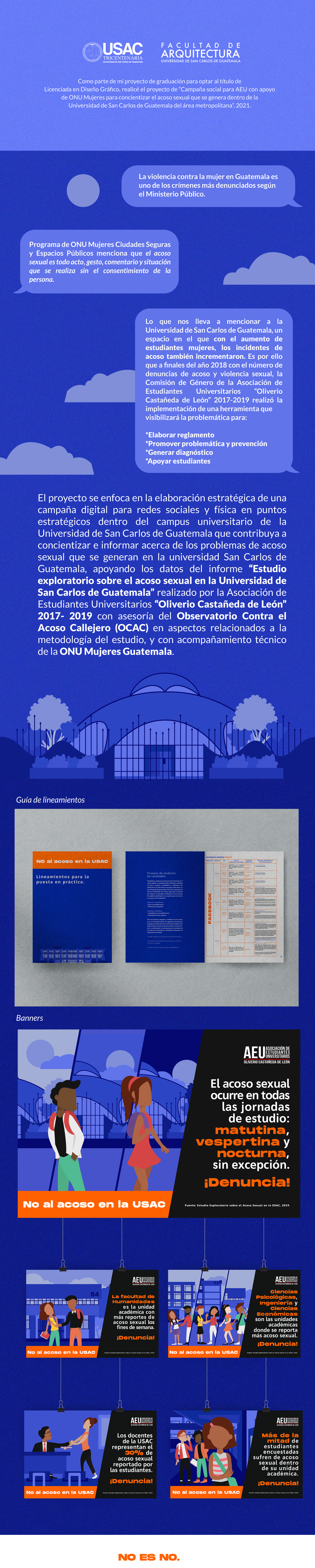 As part of my graduation project to qualify for the title of graduate in Graphic Design, I carried out the project "Social campaign for AEU with the support of UN Women to raise awareness of sexual harassment that is generated within the University of San Carlos de Guatemala of the metropolitan area, 2021.